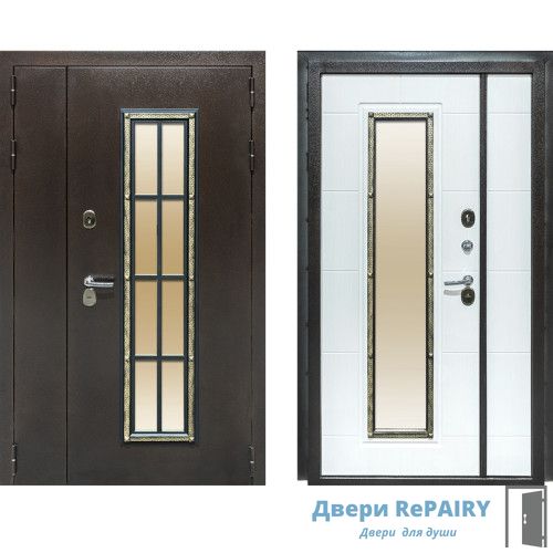 3-х контурная металл-панель. Короб закрытый утепленный (патина золото). Стеклопакет -зеркальная бронза. МДФ 10 мм Цвет внутренней накладки : Лиственницп/ Орех темный Утеплитель полотна и короба базальтовая плита Толщина полотна: 90 мм Толщина короба: 110 мм. Покраска: антик медь + Цинк (антикоррозийная обработка). Замки:Гардиан Г3201, Г3011 Фурнитура бронза Петли-3 шт Эксцентрик Уплотнитель: 3 шт - D-образный резиновый