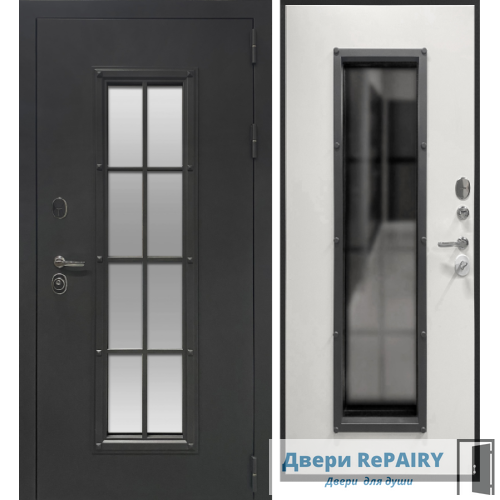 3-х контурная металл-панель. Короб закрытый утепленный. Стеклопакет - 2-х камерный зеркальный МДФ 10 мм Цвет внутренней накладки : Белый ZB 00850- 2 Утеплитель полотна и короба базальтовая плита Толщина полотна: 90 мм Толщина короба: 110 мм. Покраска: СЕРЫЙ МУАР + Цинк (антикоррозийная обработка). Замки:Гардиан Г3201, Г3011 Фурнитура хром Петли-3 шт Эксцентрик; ПОРОГ ИЗ НЕРЖАВЕЙКИ Уплотнитель: 3 шт - D-образный резиновый